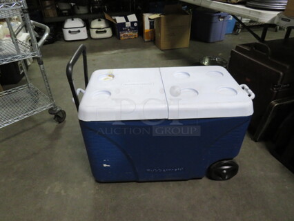 One Rubbermaid Wheeled Cooler With A Dual Flip Lid.